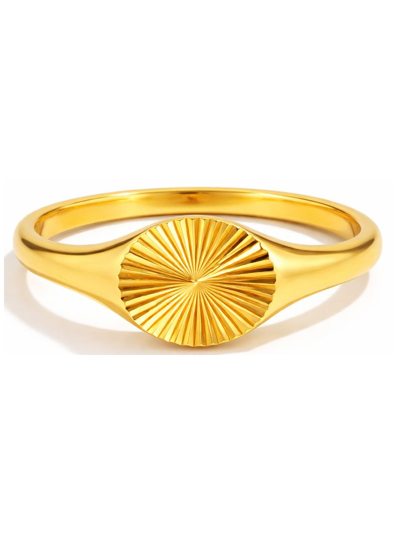 La bague Sol séduit par son médaillon rond gravé d’un motif soleil rayonnant.