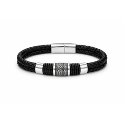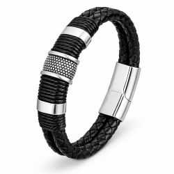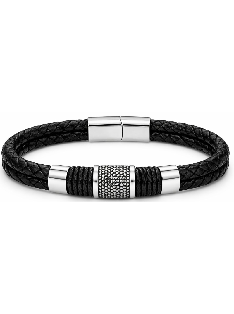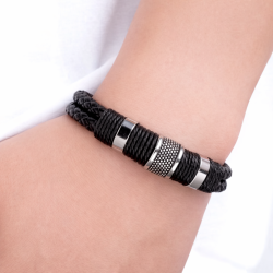 Bracelet Titan en cuir noir tressé avec finitions en acier poli et détail central texturé.