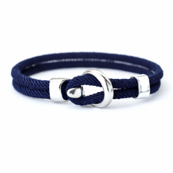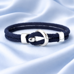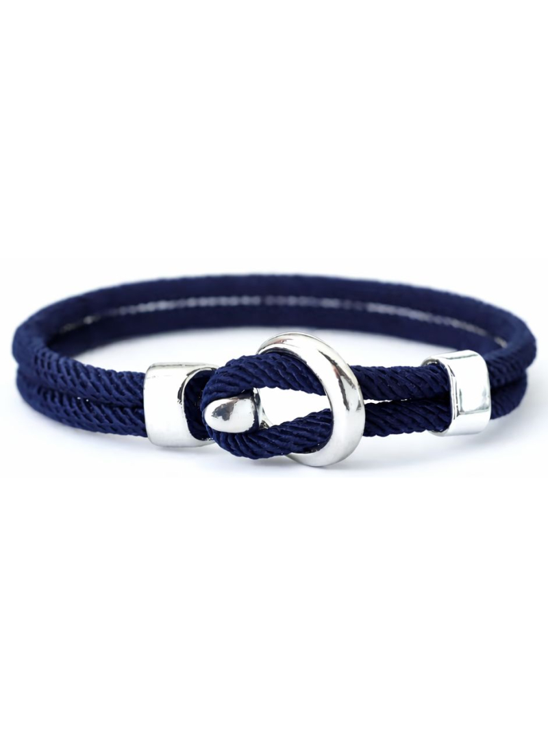 Bracelet Nordique bleu marine en corde tressée beige avec fermoir circulaire en métal argenté poli.