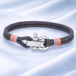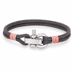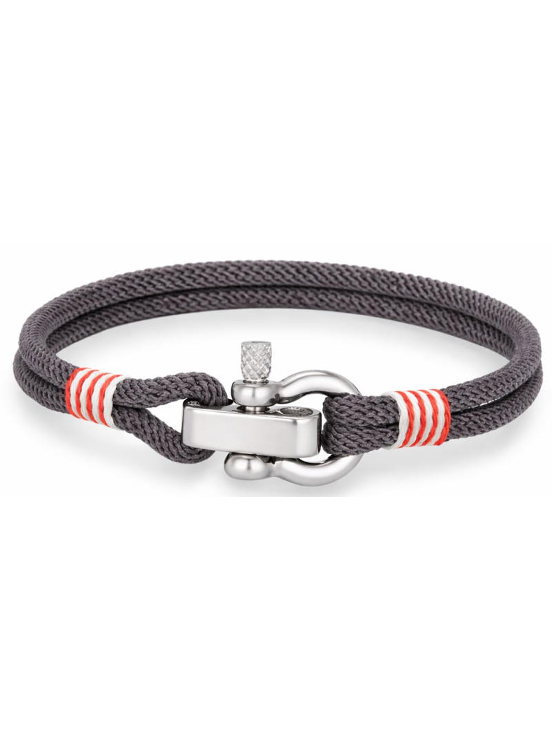 Bracelet Marin en corde gris avec détails rouges et fermoir manille en métal argenté poli.